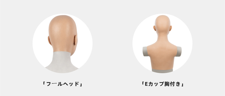 「フルヘッド」、「Eカップシリコン充填胸付き」バージョンがお選びいただけます。「フルヘッド」バージョンは義乳なし、首部分なしで、フルヘッドマスクのみになります。「胸付き」バージョンはEカップおっぱいが付き、一体化した商品になります 。