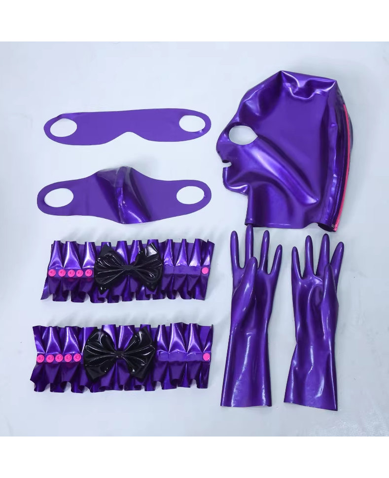 紫色 マスク&手袋&手首飾り&目マスク&口マスク5点セット ラテックス素材 厚さ0.4mm